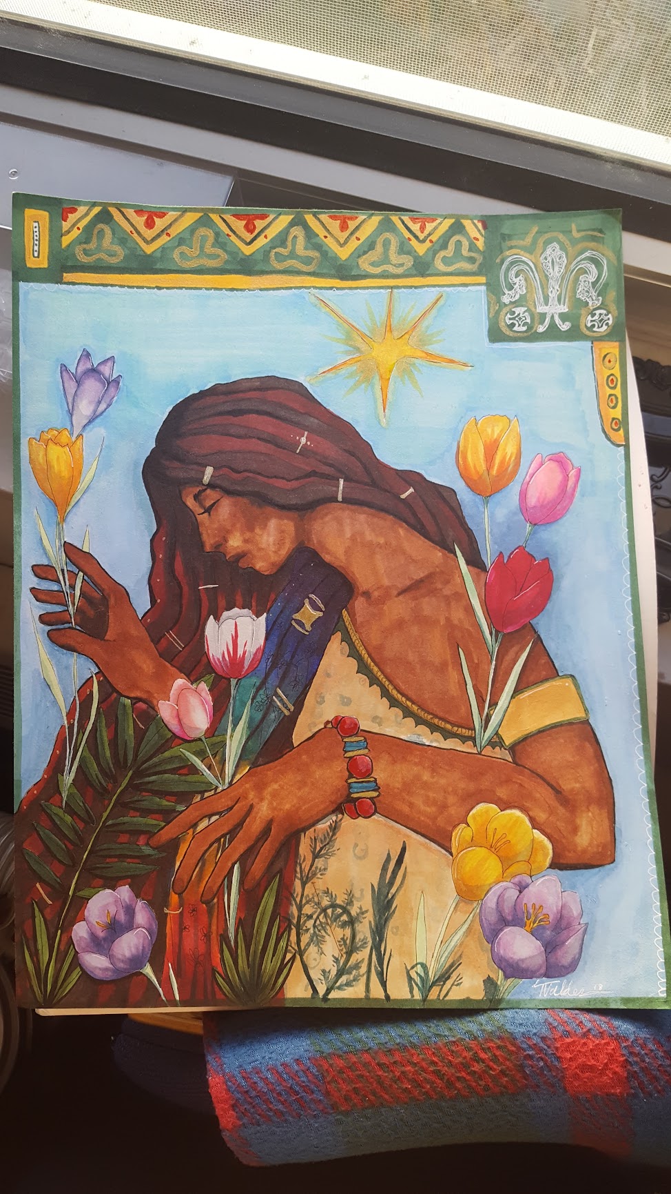 Traditional, marker on paper, illustration of a woman with flowers