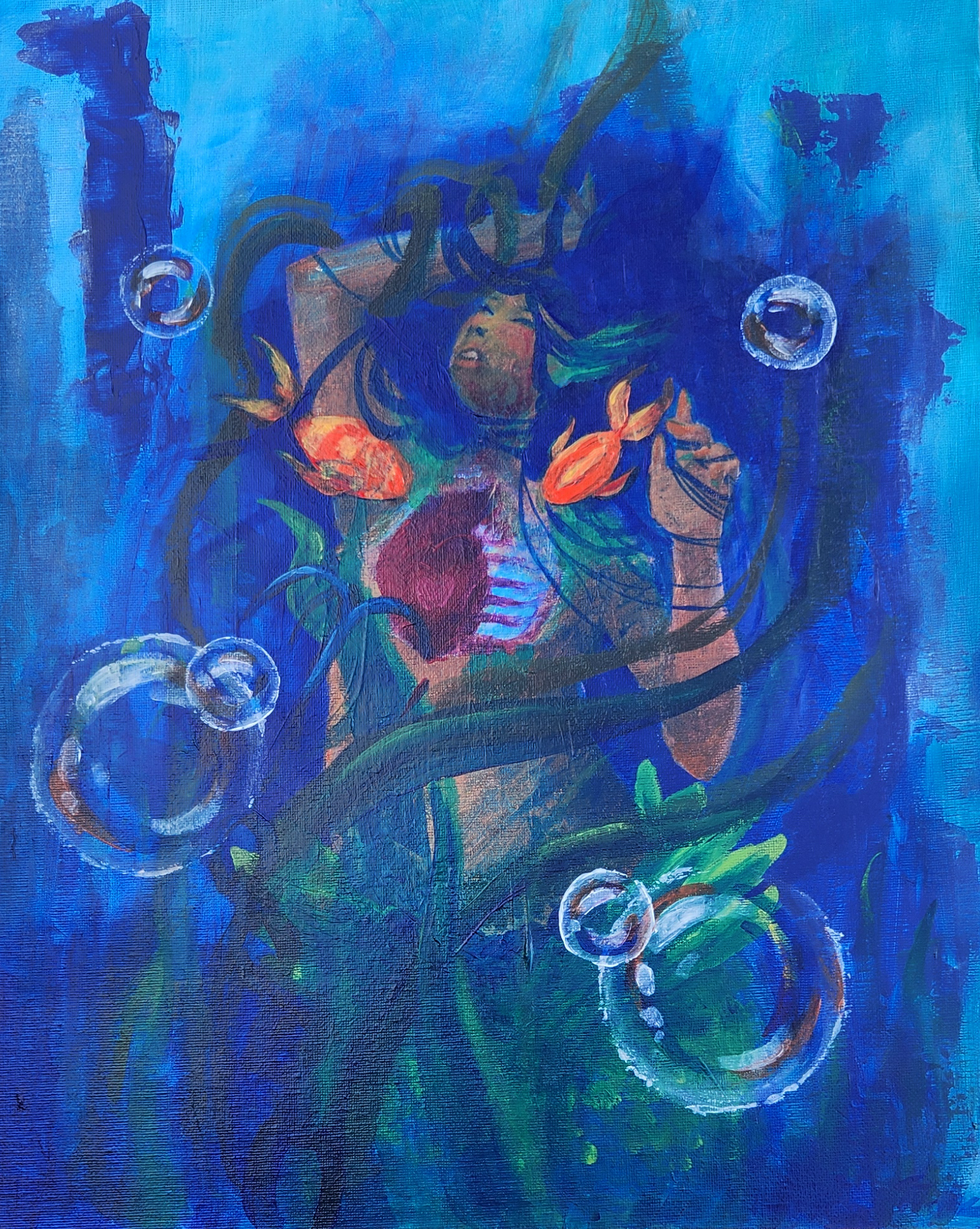 Traditional, acrylic paint on canvas board, stylized painting of a femme mermaid in distress